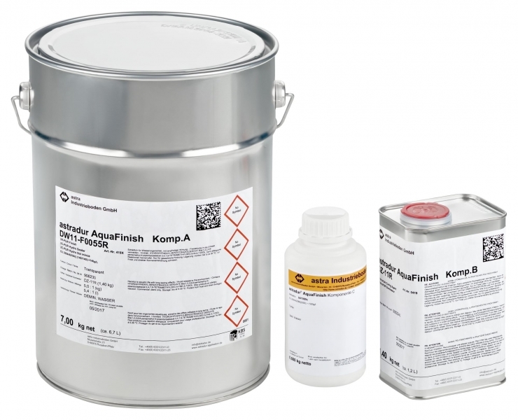 astradur® AquaFinish ist ein wasserverdünnbarer dreikomponentiger Beschichtungsstoff auf Basis von Polyurethan. Das Material ist geruchsarm, nicht brennbar und nicht explosionsgefährlich. Es lässt sich vorzüglich verarbeiten. Versiegelte Flächen zeichnen sich durch eine gleichmäßige Optik und eine gute Reinigungsfähigkeit aus. astradur® AquaFinish wird als seidenmattes Finish auf glänzenden Epoxidharz- sowie Polyurethan-Beschichtungen verwendet. Besonders interessant ist der Einsatz bei Objekten, wo die üblichen lösemittelhaltigen Versiegelungen nicht eingesetzt werden können.
